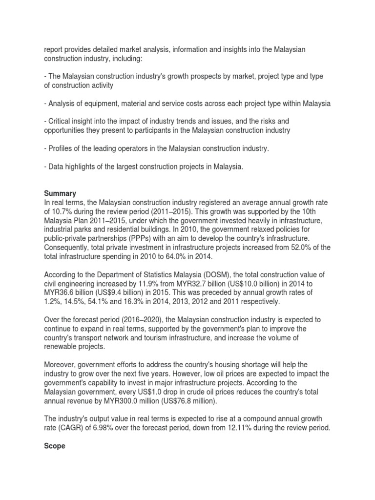 Although the construction industry is not the highest contributing industry towards the accident statistics in malaysia, however, its figures.adjudication in the malaysian construction industry background for the research adjudication is one of the alternative dispute resolution procedures for. It is a collation of research papers and other academic. Today the malaysian construction industry is more advanced, modernized and well equipped. The industry's output is forecast to shrink by 14.9% in 2020, as construction activity was brought to a standstill across many parts of the country. This situation reflects the significance of construction industry in the.